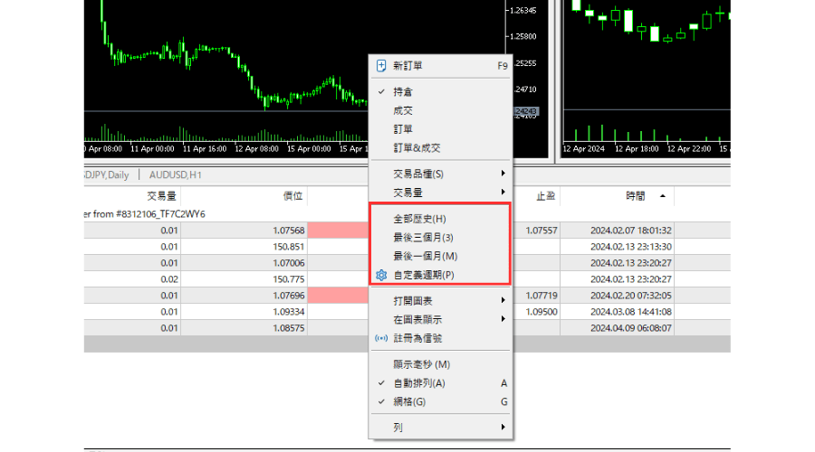 在「历史」标签中点击右键,在选单上方的「全部历史」、「最后三个月」、「最后一个月」、「自定义周期」中可以指定交易历史的时间。