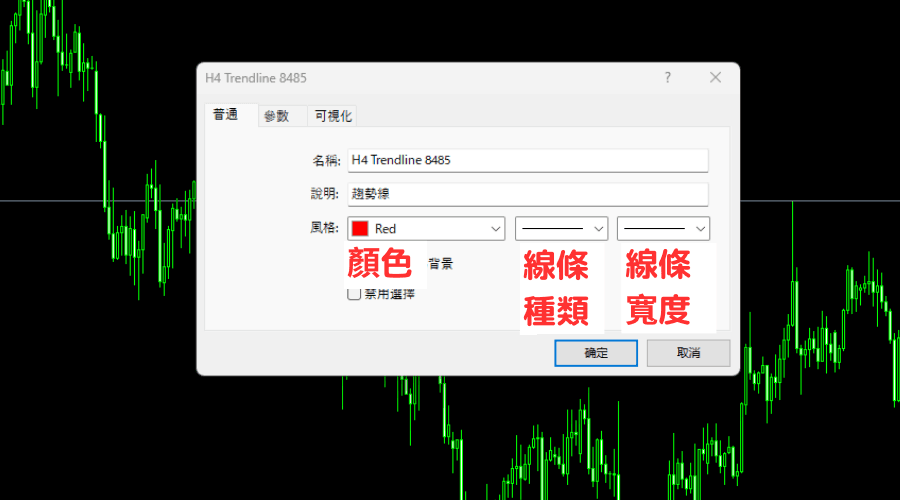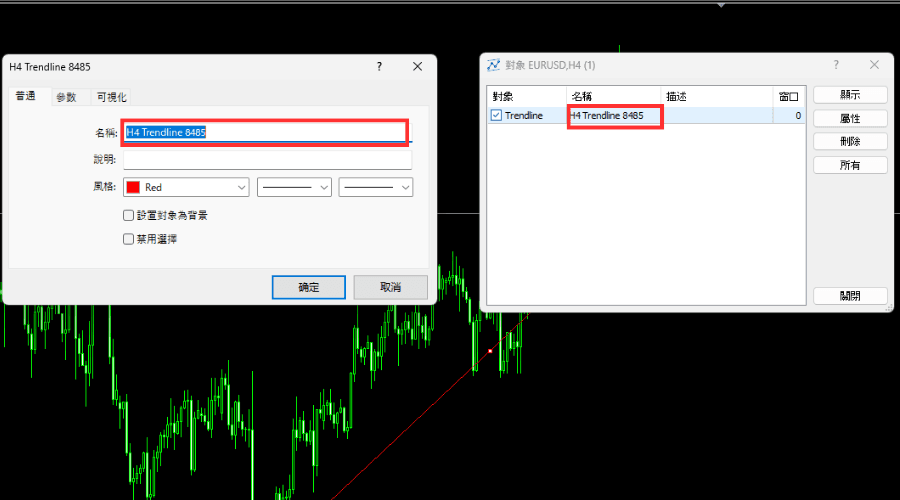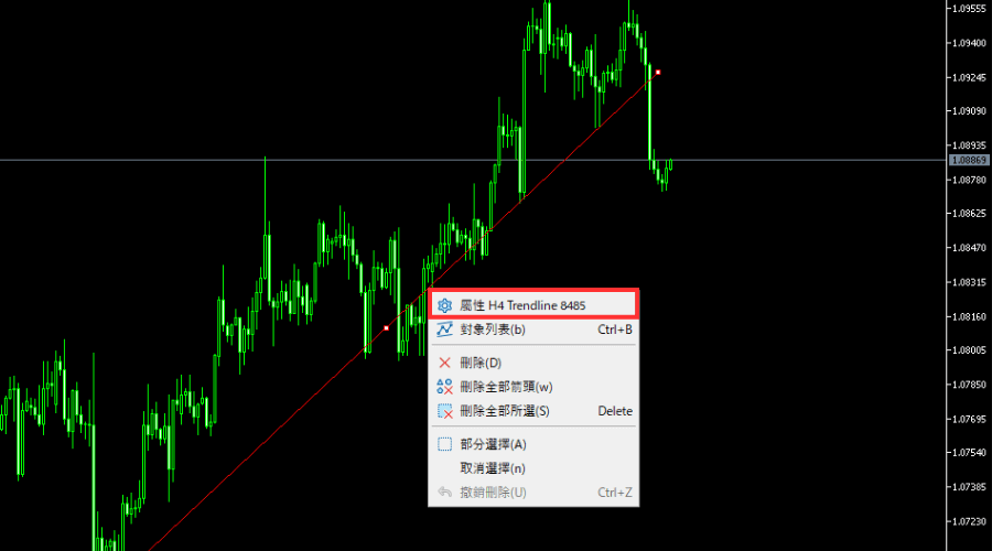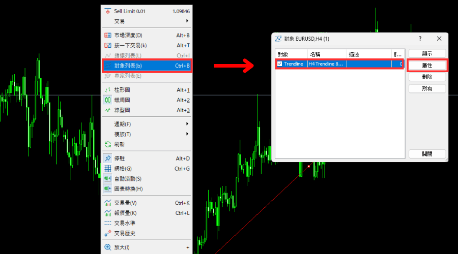 在图表中点击右键,然后点击选单中的「对象列表」,从列表一览中选择想要修改的线条,点击右键就可以打开线条的属性视窗。