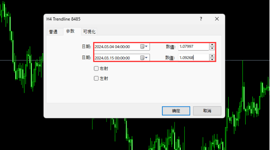 「参数」标签中可以根据更详细的价格与时间来设置线条的起点与终点。
