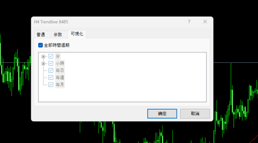 勾选「全部时间周期」的话,线条就可以在全部时间周期中显示。 取消勾选的话,就可以在下面的时间周期中切换显示与不显示的时间周期(只会在勾选的时间周期中显示线条)。