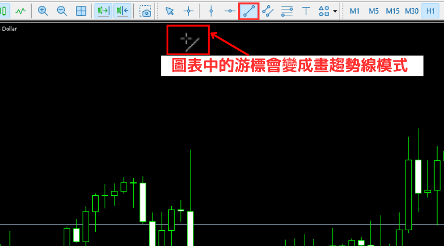 首先点击工具栏中的趋势线图标,然后在图表中移动光标时可以确认光标已切换为绘制模式。