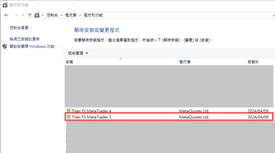 第二步:双击「解除安装或变更程式」中的Titan FX Meta Trader5