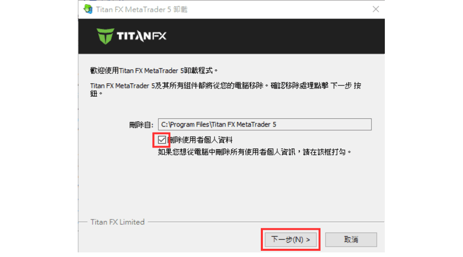 第三步:在卸载窗口中勾选「删除使用者个人资料」,然后点击「下一步」就会开始卸载