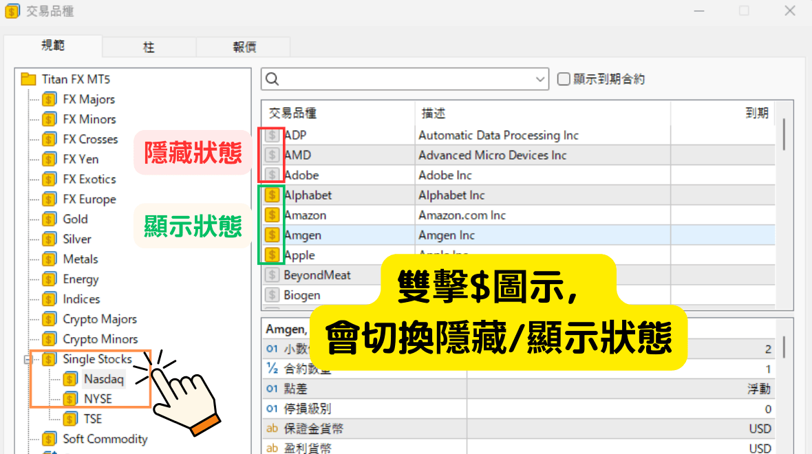 点选「Single Stocks」内的「nasdaq」和「NYSE」,选择美股CFD品种。双击$图示,会切换隐藏/显示的状态。