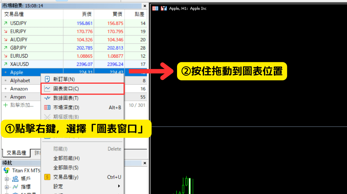 将游标移到想要交易的美股CFD商品位置,点击右键,选择「图表窗口」,或直接按住拖动到图表位置,图表就会显示出来。