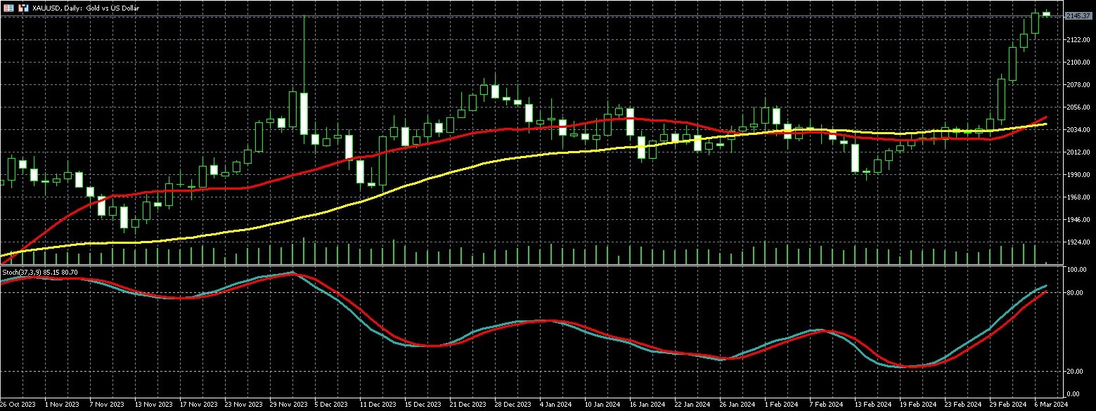 黄金价格周三 (6 日) 再创历史新高,主要系由对美国货币宽松政策的押注推动,4 月交割的纽约黄金期货上涨 0.95% ,收每盎司 2148.01 美元。