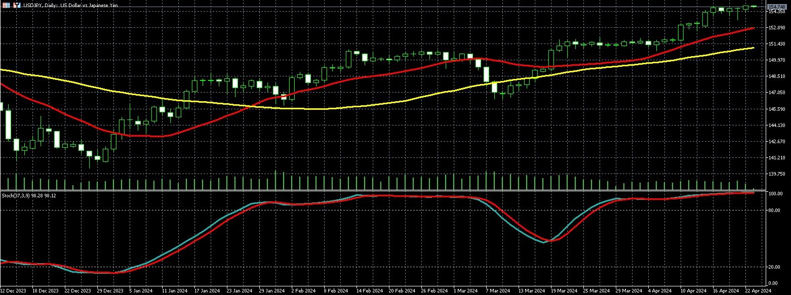 美元兑日圆周一(22 日) 再触34 年新高,市场参与者持续受联准会(Fed) 对高利率维持更久的立场影响,同时对日本当局进场干预支撑日圆汇价的任何迹象保持警惕 。