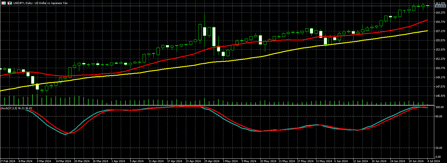 在美国7 月4 日假期即将到来前,日圆仍是主要焦点,美元兑日圆周三续创38 年来低点,美元兑日圆周三再跌0.15% 至1 美元兑161.65 日圆,日圆汇价持续螺旋式下降,市场人士对日本干预以提振日圆汇率提高警觉。