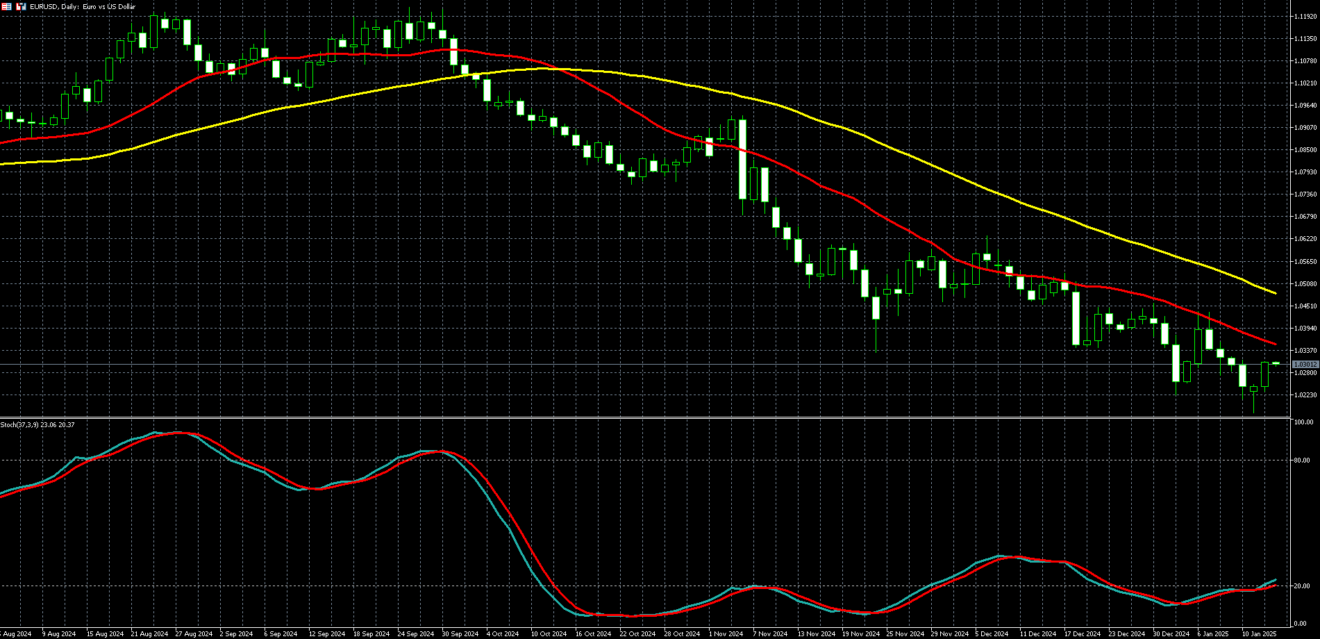 欧元兑美元走势图(上图红线为 20MA, 黄线为 50MA,下图为 KD 震荡指标)