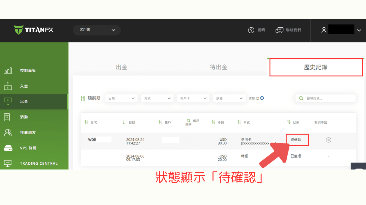 您也可以在「出金-历史记录」中,查看到出金申请显示为「待确认」的状态。
