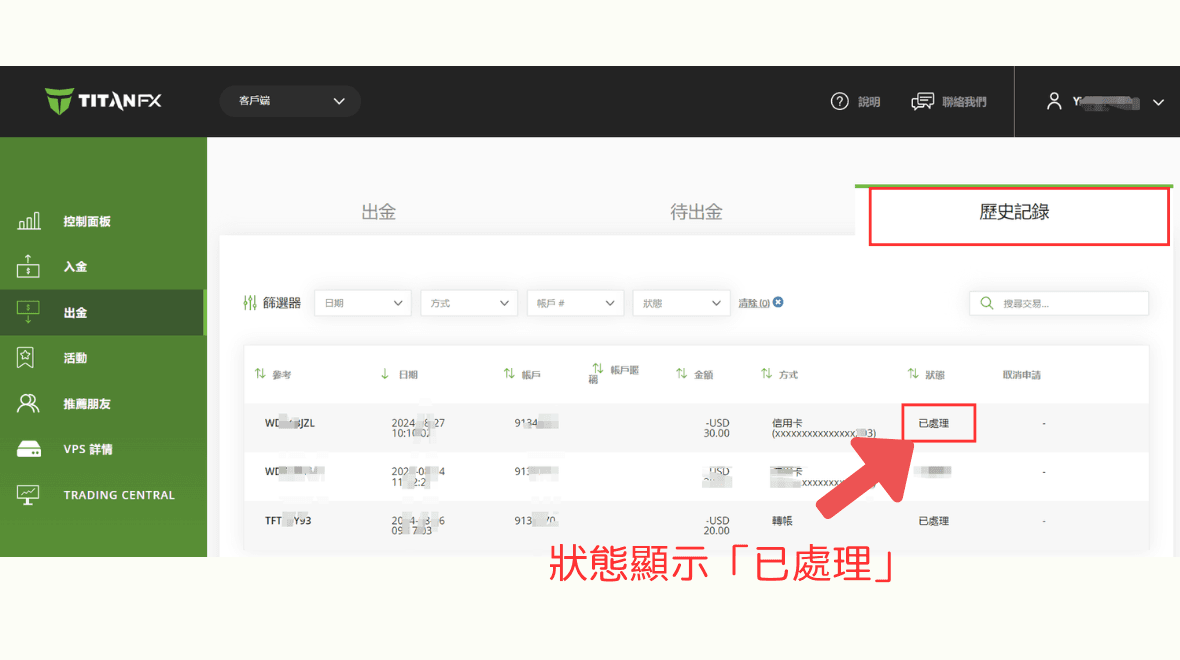 您可以在客户端内的「出金-历史记录」中,查看到出金申请显示为「已处理」的状态。