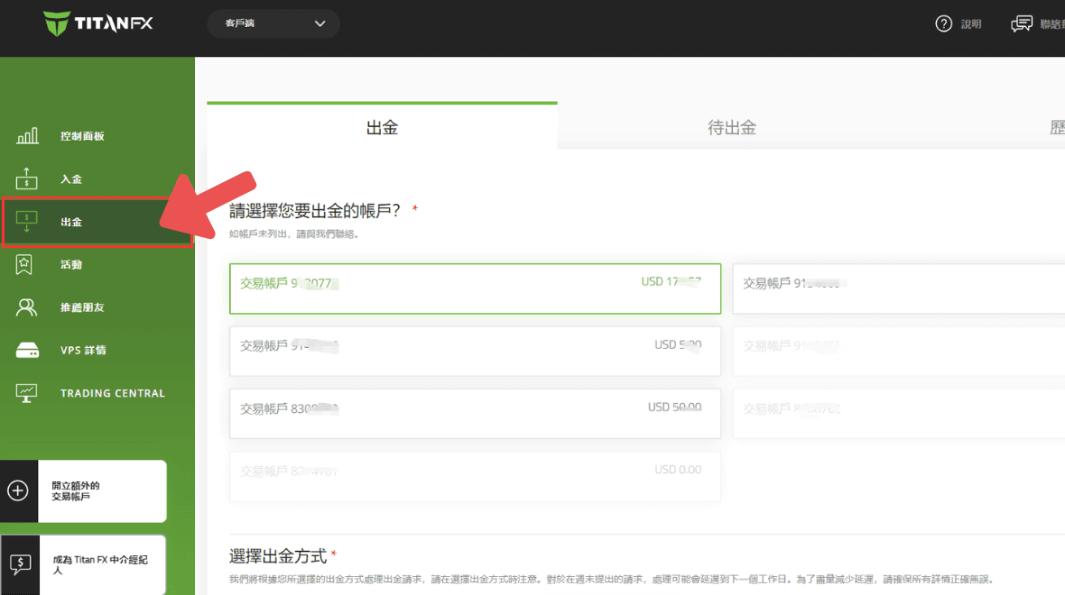 点选客户端左边选单中的「出金」。