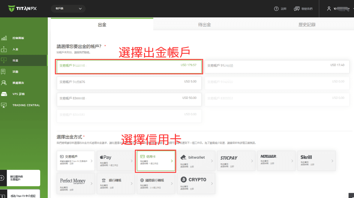 在出金页面中,先选择想要出金的帐户,然后选择信用卡出金。