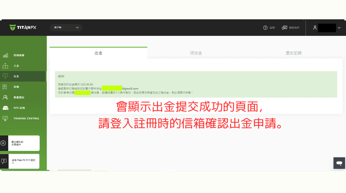 会显示出金提交成功的页面,请登入注册时的信箱确认出金申请。
