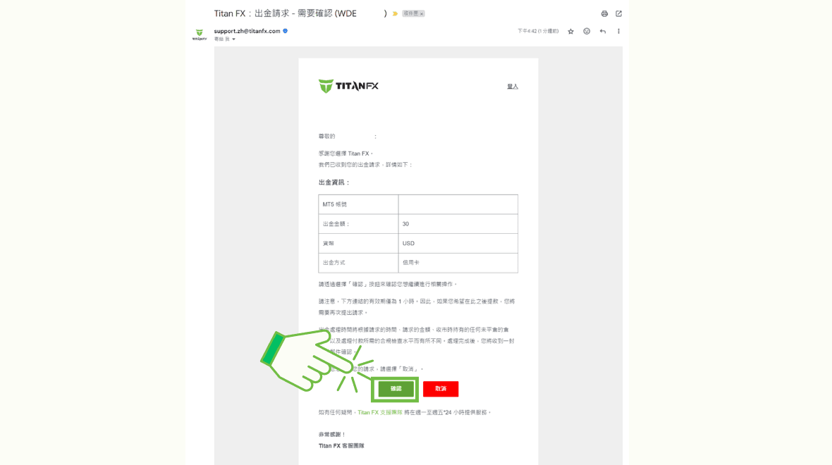 注册时的信箱会收到一封主旨为「出金请求 - 需要确认」的邮件,请点选底部「确认」按钮。