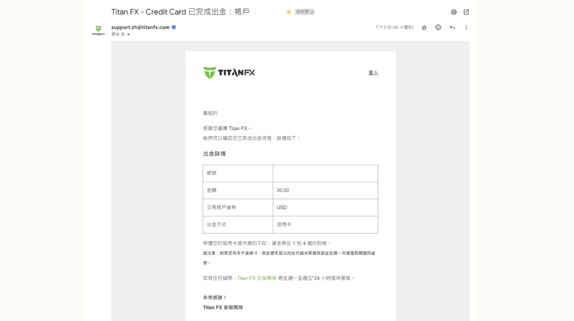 此时,会收到主旨为「Credit Card 已完成出金」的邮件。