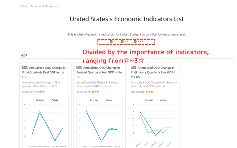 After accessing the page for all economic indicators of the selected country, you can filter and quickly review relevant data based on indicator type and importance.
