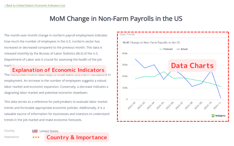 The economic indicator details page consists of two main sections. Below, we use the U.S. Non-Farm Payroll data as an example to explain its structure and content.