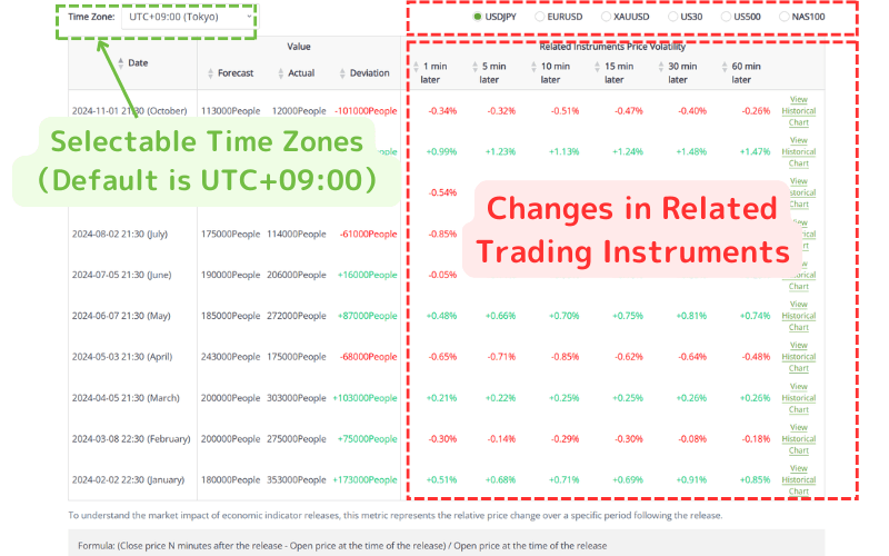 On the right side, you can view the price changes of major assets following the release of the economic indicator. These include USDJPY, EURUSD, XAUUSD, US30, US500, and NAS100, making it easier to analyze market reactions effectively.