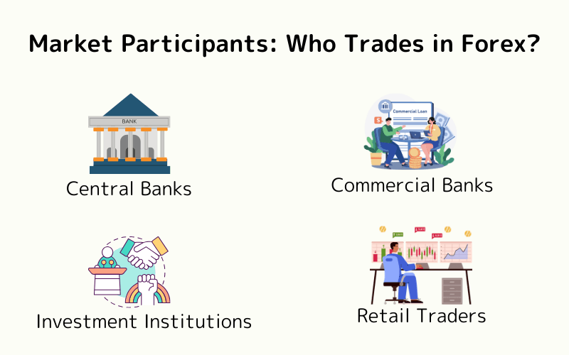 The forex market includes a wide range of participants: