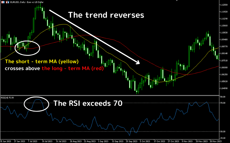 In the chart, a short-term moving average crosses above a long-term one, while RSI surges past 70, indicating robust bullish momentum and an accelerating rally. However, after entering overbought territory, prices reverse sharply, forming a topping signal with a notable pullback.