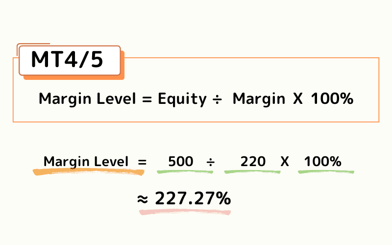 Margin Level = 500 (equity) ÷ 220 (margin) × 100% ≈ 227.27%