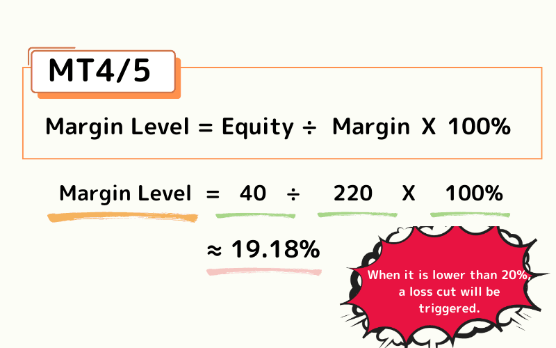 Margin Level = 40 (equity) ÷ 220 (margin / minimum margin) × 100% ≈ 19.18%
