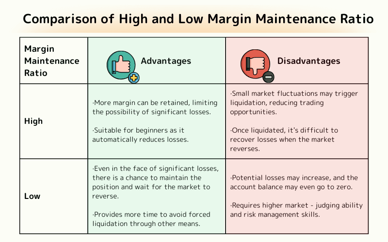 | High | - Allows more margin to remain, limiting the potential for expanding losses. - Suitable for beginners, automatically reducing losses. | - Small market fluctuations may trigger loss cut, reducing trading opportunities. - Once loss cut occurs, it's difficult to recover losses with a market reversal. |