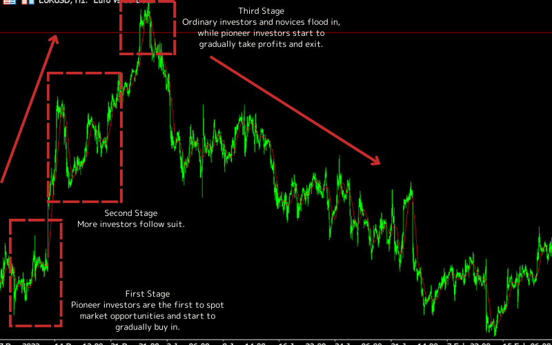 The media reports extensively, trading volume surges, and retail investors flood in. Meanwhile, pioneering investors begin to realize profits, signaling that the trend is nearing its end. The stages of a downtrend are the reverse.