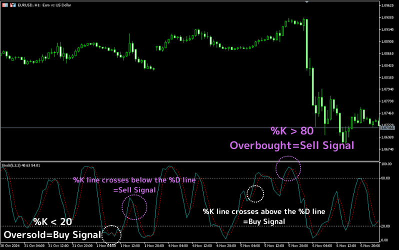 | %K and %D Crossovers | A %K line crossing above the %D line is a buy signal, and a %K line crossing below the %D line is a sell signal. |