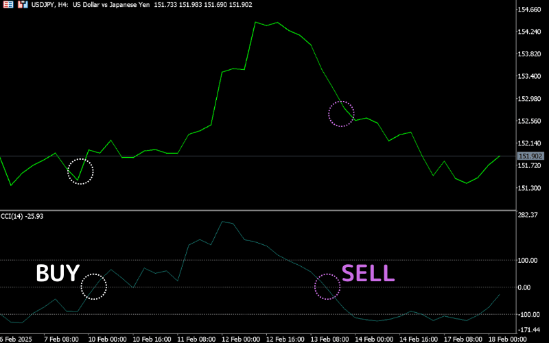 | CCI Zero Line Crossovers | A CCI crossing from below to above zero is a buy signal, and a CCI crossing from above to below zero is a sell signal. |