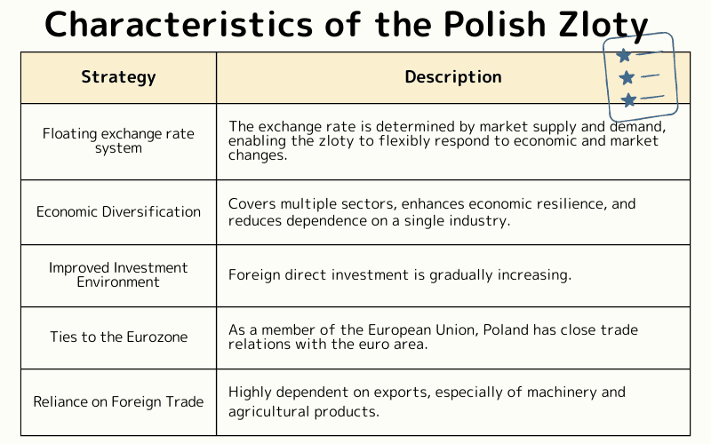 Since the 1990s, the Polish Zloty has followed a floating exchange rate system, where the exchange rate is determined by market supply and demand. This allows the Zloty to adjust flexibly to economic and market changes.