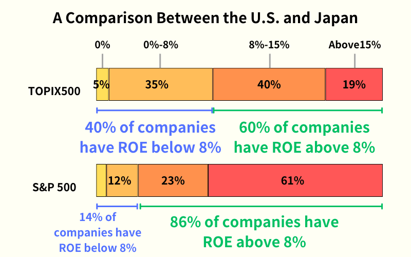 - In the TOPIX 500, 40% of companies have an ROE below the 8% standard.