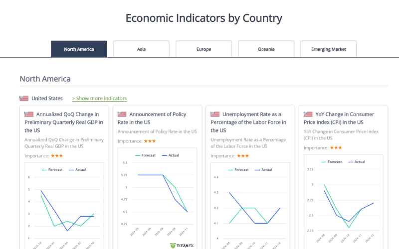 Titan FX provides economic data indicators for major countries such as the US, EU, Japan, and China. You can query data by release time, country, and importance.