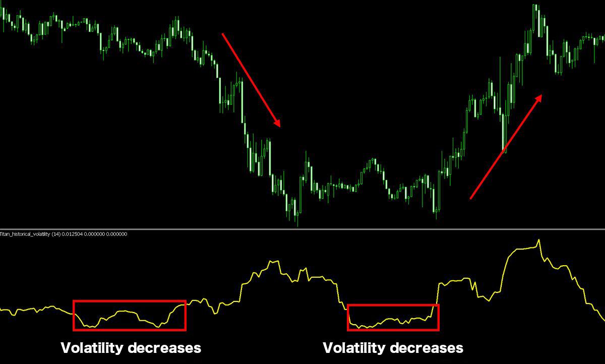 Historical Volatility is an indicator that displays the standard deviation of volatility over a past period on a sub-chart. This indicator allows you to quickly grasp trends in volatility.