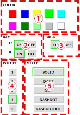 The top row of the palette labeled 'COLOR' (Image①) allows for switching line colors by clicking. The middle left labeled 'RAY' (Image②) toggles the extension of lines in MT5 ('L' for left-side starting point, 'R' for right-side endpoint, with 'ON' extending and 'OFF' not extending). In MT4, 'ON' extends only the right side (endpoint), and 'OFF' does not extend.