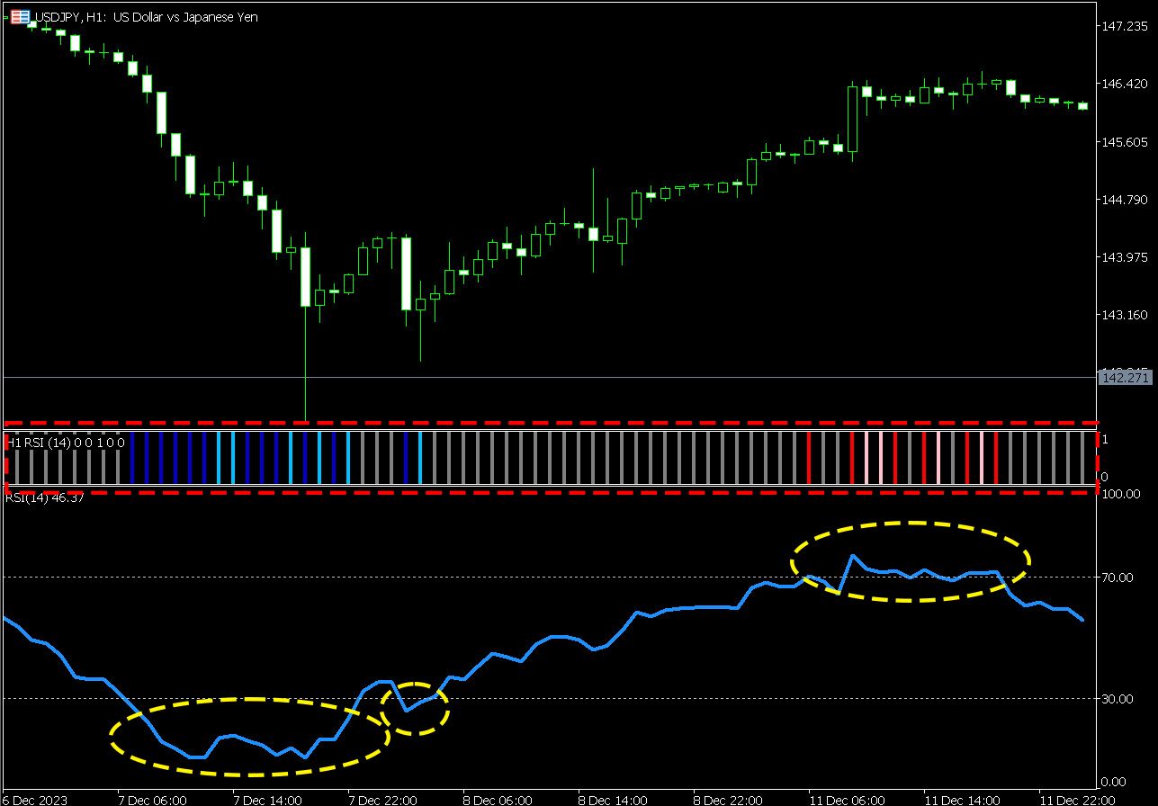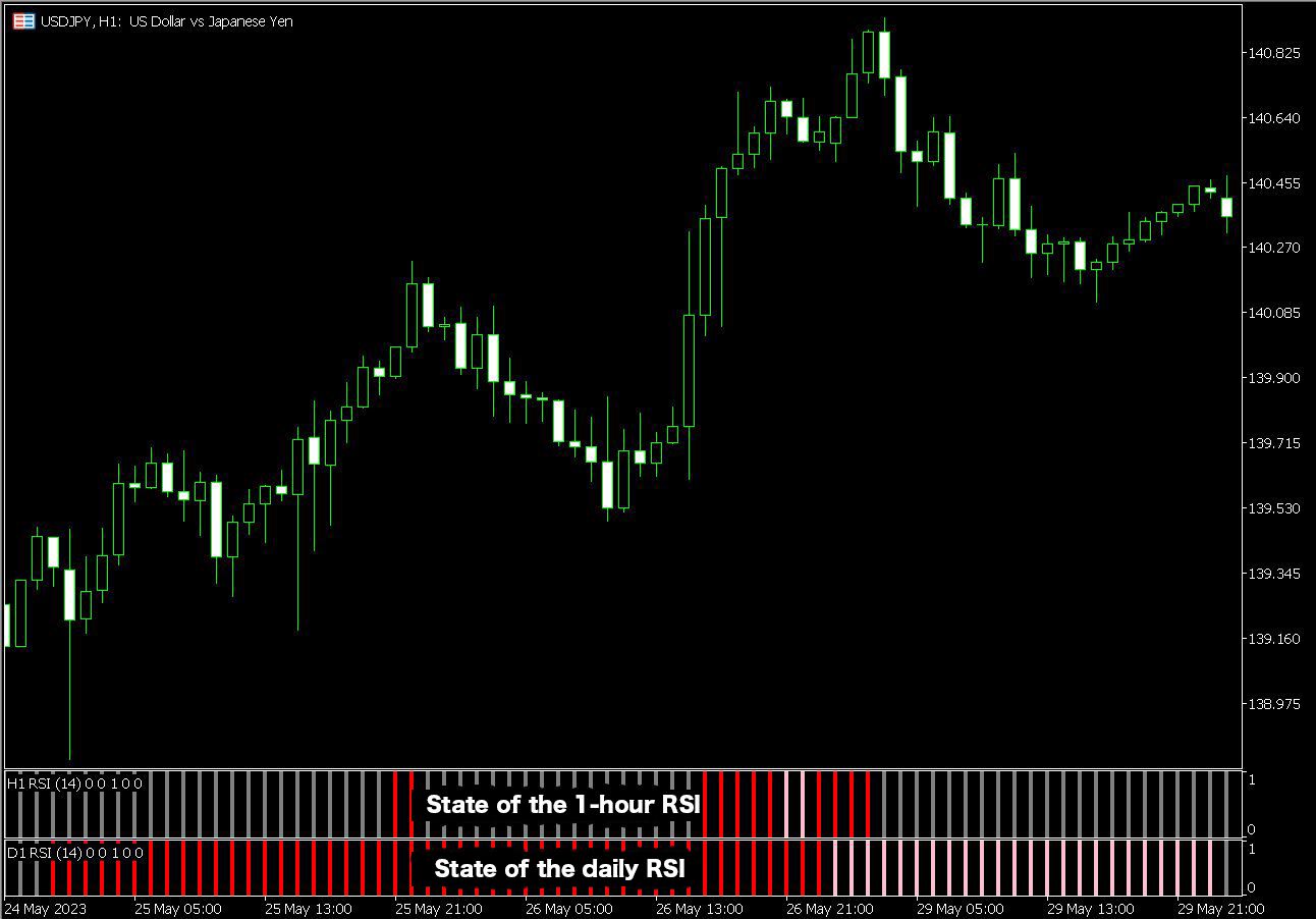 【Example showing the state of the RSI for 1-hour and daily timeframes on a 1-hour chart】