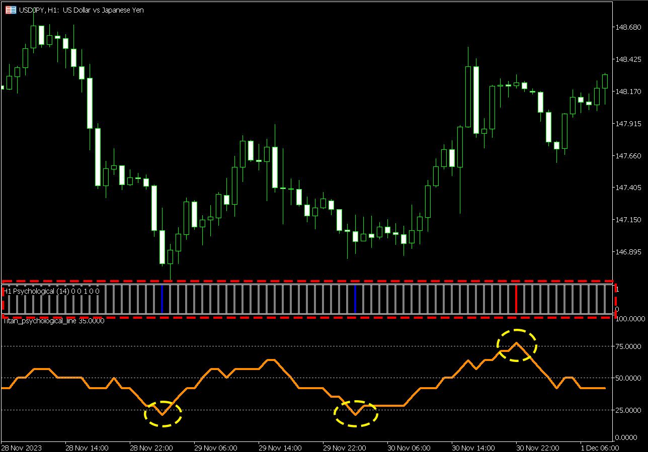 【Example showing the state of the Psychological Line (Note: Psychological Line itself is not displayed by this indicator.)】