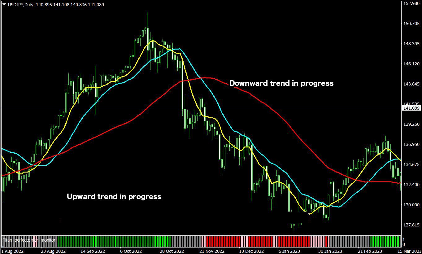 Conversely, when the moving averages are aligned from longest to shortest from top to bottom, they are displayed in pink (default setting), and if their slopes are downward (lower than the previous bar), they are displayed in red (default setting).