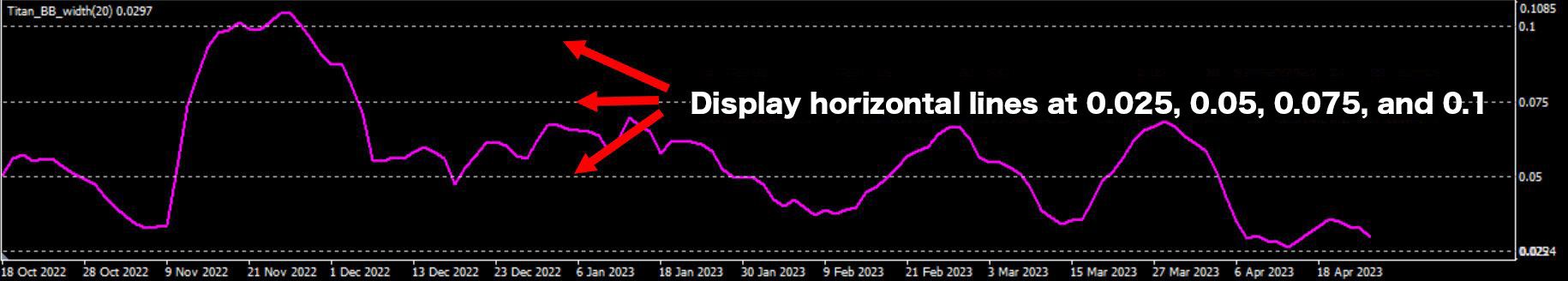 The Bollinger Band Width (Titan_BB_width) indicator displays the width of the Bollinger Bands on a sub-chart.