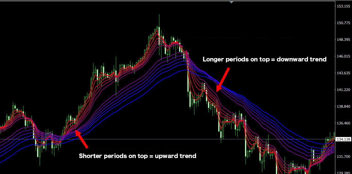 GMMA displays multiple moving averages of different periods. When the order of moving averages is from the shortest at the top to the longest, it indicates a strong uptrend; if from longest to shortest, a strong downtrend, increasing the anticipation of trend continuation.