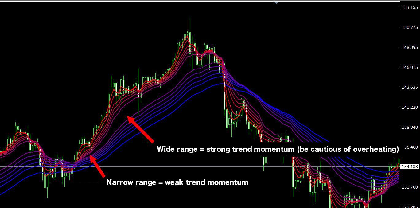 In GMMA, attention is also paid to the distribution (width) of each moving average during a trend. A wider distribution of moving averages indicates significant movement in short-term EMAs, suggesting strong market momentum.