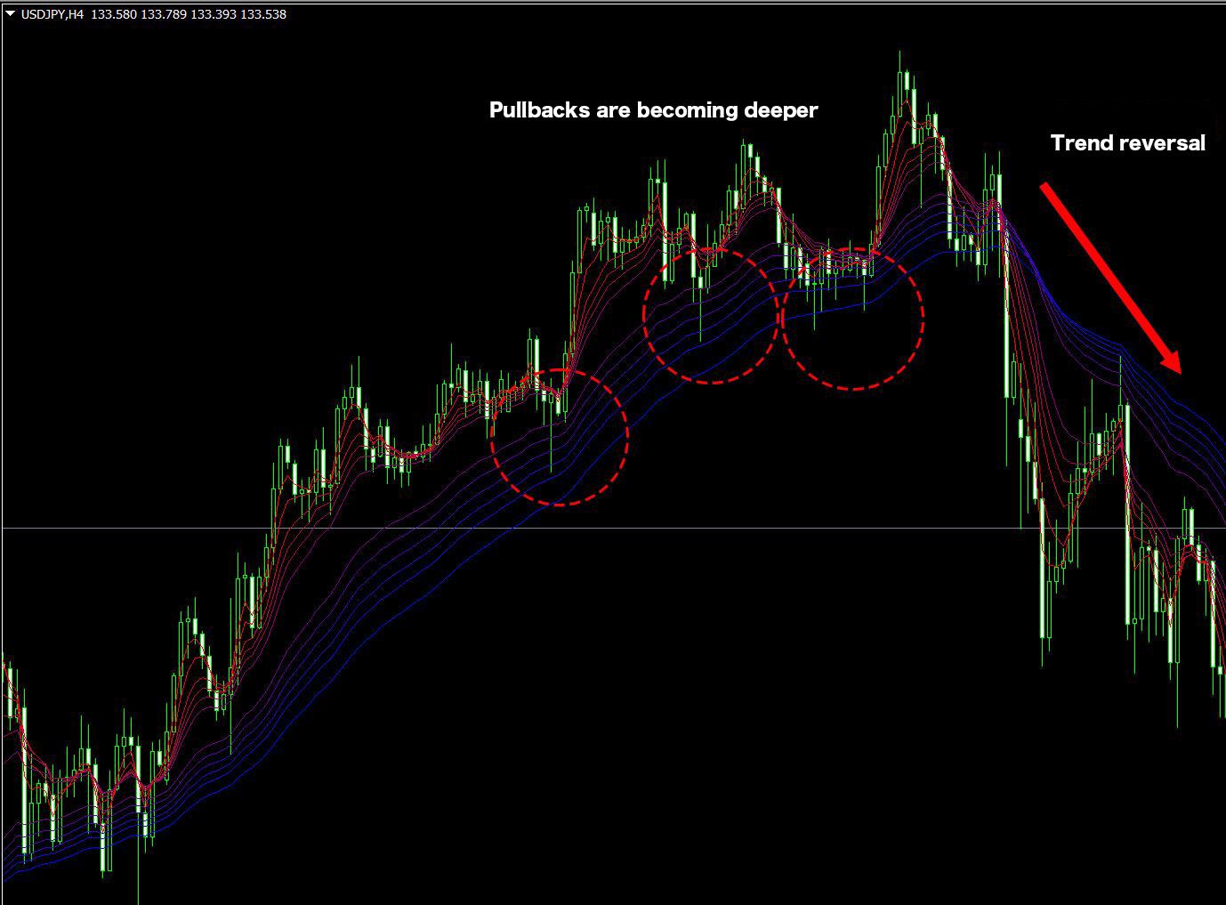 When a trend is occurring in GMMA, it is also important to monitor how far pullbacks and rebounds reach. Large pullbacks or rebounds may indicate that the momentum of the trend is weakening.