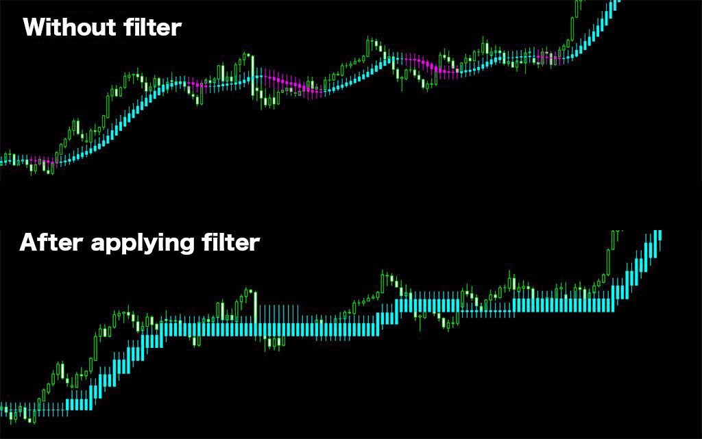While trend indicators inherently encounter false signals, this indicator includes a filter function that mitigates them. This filter displays the same value as the previous candle if the change in the four values calculated for the Heikin-Ashi does not exceed a specified range. If the change exceeds the set range, then it updates to show the new value, helping to avoid unnecessary fluctuations in sideways markets.