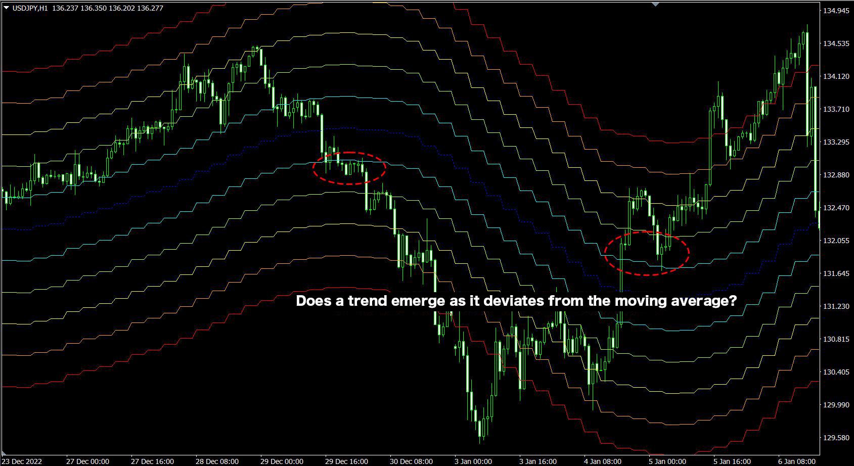 Analysis Example 1: Checking for signs of trend initiation When prices deviate from the moving average, it can indicate the start of a trend. Analyzing how much deviation typically leads to trend formation can be insightful.