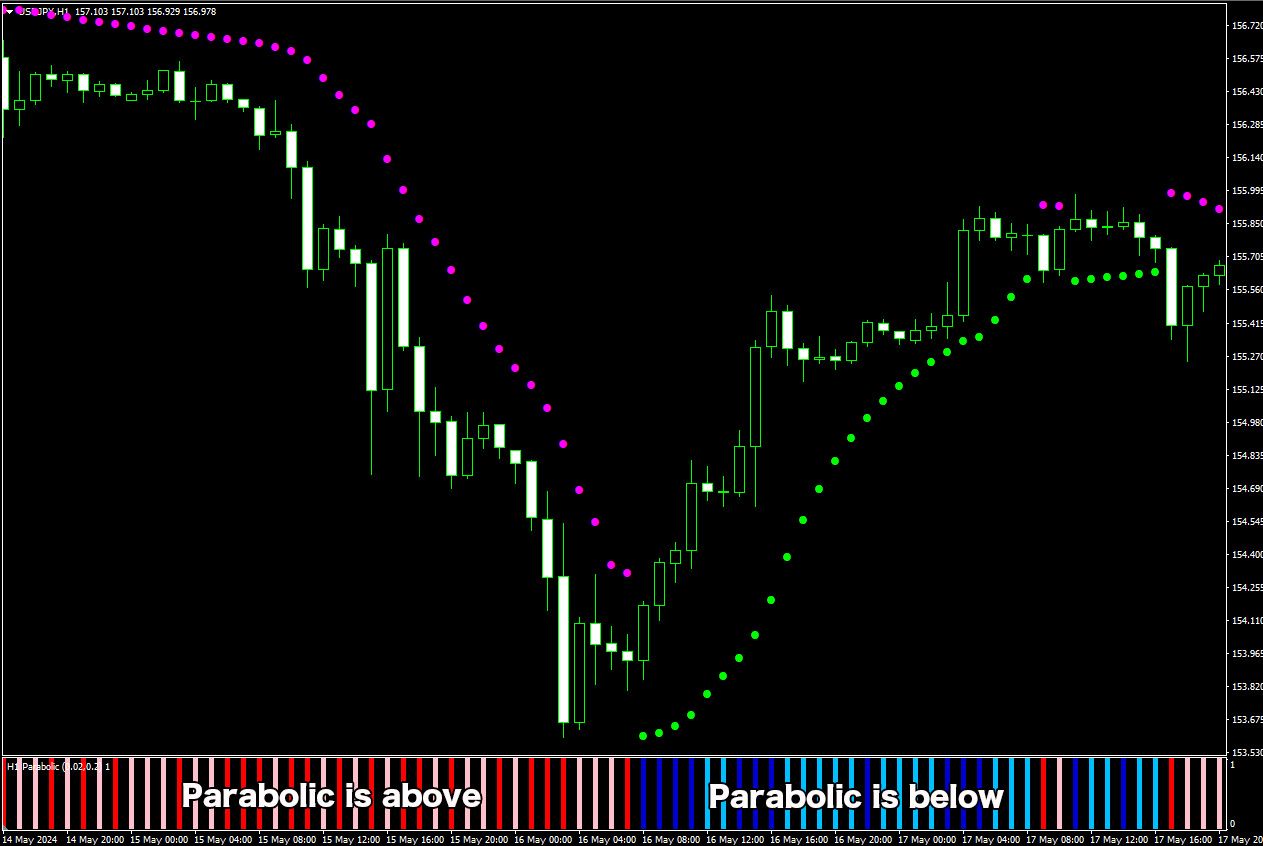 【Example showing Parabolic SAR status (Note: Parabolic SAR is not displayed by this indicator itself.)】
