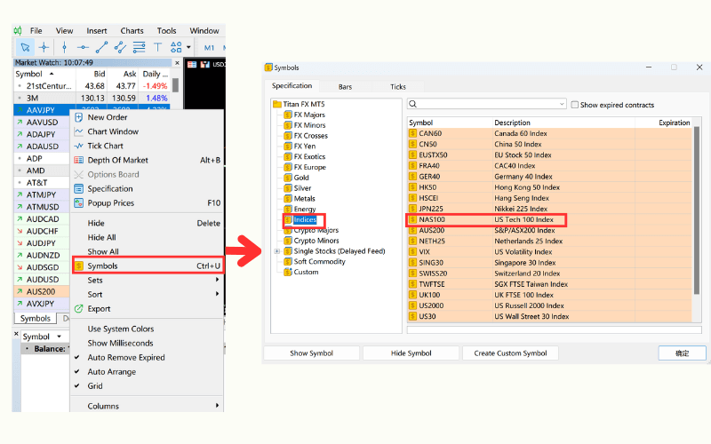 Right-click in the "Market Watch" window, click "Symbols," and double-click "indices" to find "NAS100." This will display the NAS100 quote in the "Market Watch" window.