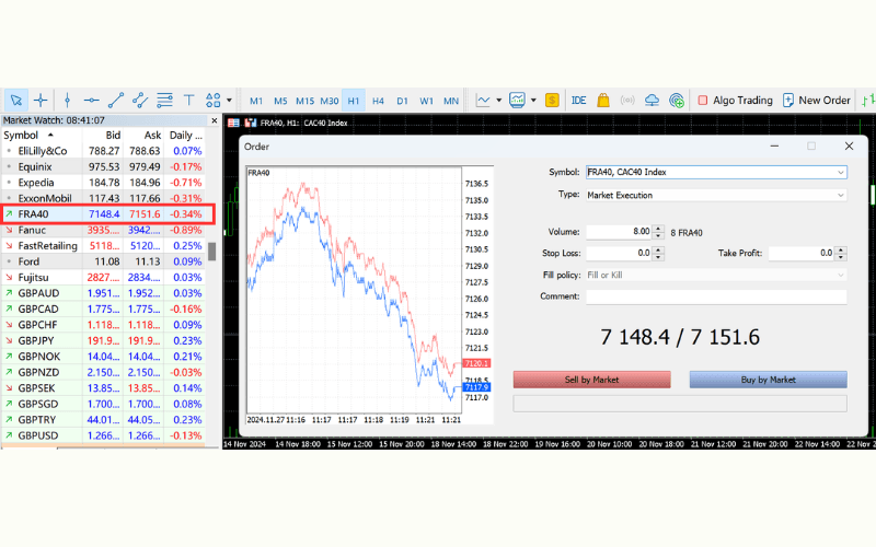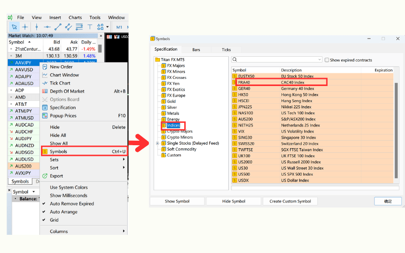 In the "Market Quotes" window, right-click, select "Symbols," and double-click "indices" to find "FRA40." This will display the CAC40 index price in the "Market Quotes" window.