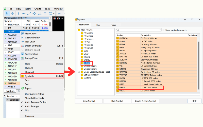 Right-click in the "Market Watch" window, click "Symbols," and double-click "US500" under the "Indices" section. This will display the US500 quote in the "Market Watch" window.