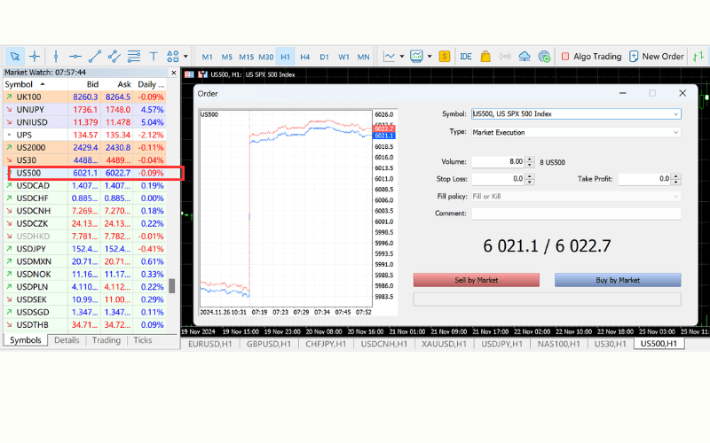 Double-click on the US500 quote or open the US500 chart to start trading.